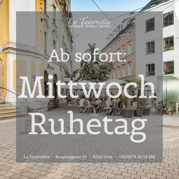 Willkommen im Herzen Italiens und willkommen im wohl besten italienischen Restaurant von Graz, dem Ristorante La Tavernetta. Das Lokal befindet sich in der Altstadt von Graz am Südtirolerplatz, nur wenige Fußschritte entfernt vom Grazer Kunsthaus. Wer in die Genusswelt Italiens eintauchen will ist hier richtig aufgehoben, und wird sich bei Fisch, Pasta, original italienischer Pizza und anderen italienischen Spezialitäten wie im Urlaub fühlen.